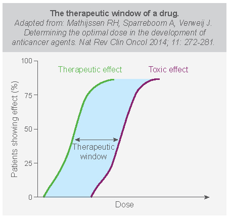 注解 :在这一模型中,该药在阈值药富集下效果较低,并产生上值毒效7对动脉抑制器而言,虽然观察到的不良作用类型可能不同于经典细胞毒剂类型,但治疗窗口也可能被认为狭窄,因为相关毒性可能是严重的、剂量限制和潜在威胁生命的